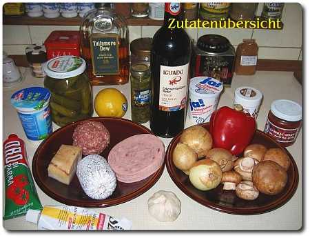 | Knoblauchzehen, Edelsüßpaprika, Paprika scharf / Sambal-Oelek, Pfeffer, etwas Kümmel, Lorbeerblatt, Piment, Kapern, etwas Senf, Fleischbrühe, saure Sahne, etwas Rotwein, Zitronensaft, Schlagsahne | |