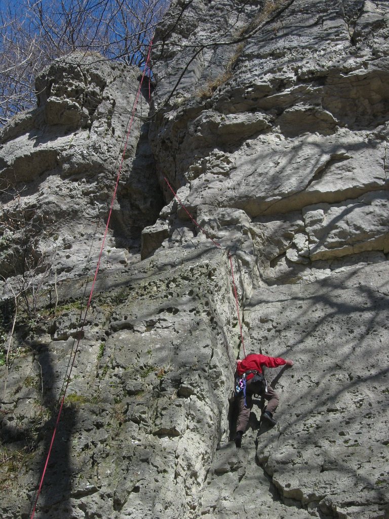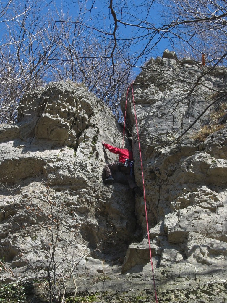- im ersten Teil mit Klemmkeilen, am Einstieg in den Kamin ein Bohrhaken