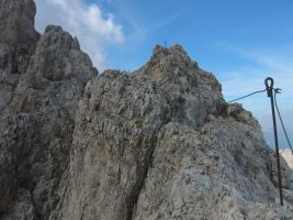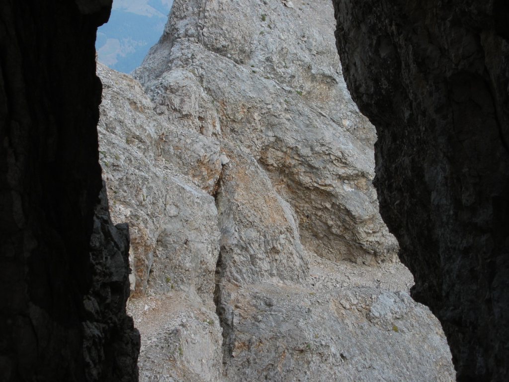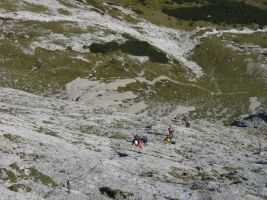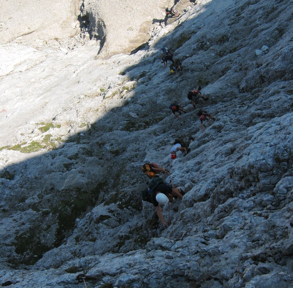 Nach etwas weniger als der Hälfte der Wegstrecke ging es in die rechte Bergflanke der Punta Serauta. Das war dann der eigentlich schwierige und sehr ausgesetze Teil des Weges. Weiter ging es hoch auf einen schmalen Grat, der von Scharten unterbrochen wurde, in die man abklettern musste. Kurz vor Ende gab es noch eine besondere Überaschung - eine senkrechte Wand, in der es auf einer alten Steiganlage aus dem ersten Weltkrieg etwa 10 m hinunter ging.