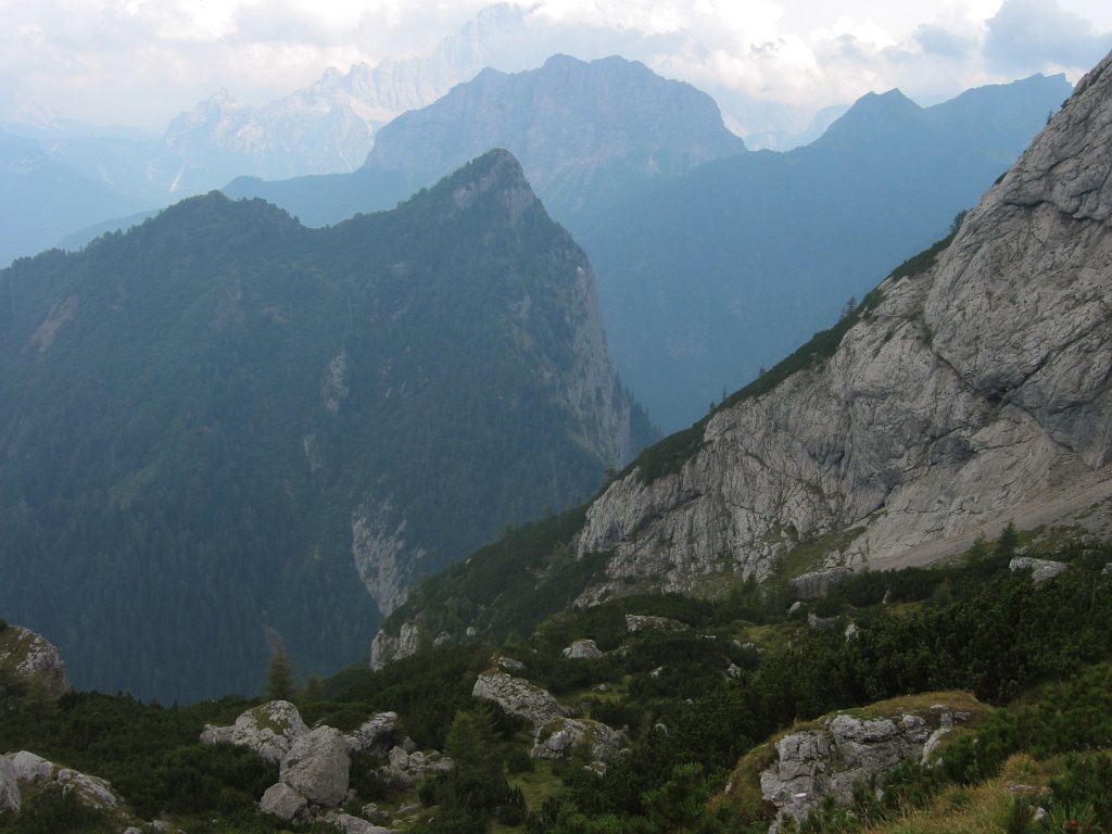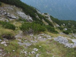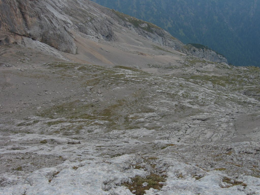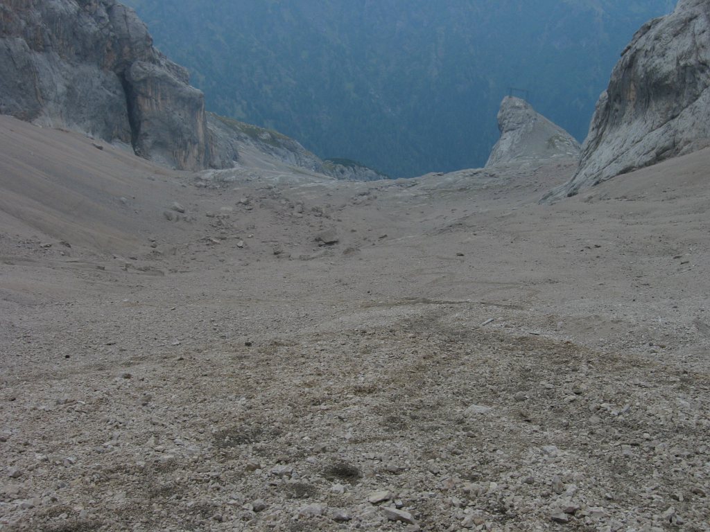 Eigentlich wollte ich mit der Seilbahn fahren. Es gab aber keinen Ticketschalter. Also machte ich mich auf die Suche nach dem Abstiegsweg. Kurz hinter der Seilbahnstation wurde ich endlich fündig, nachdem ich erst in der falschen Richtung gesucht hatte. Ein Stahlseil war im Fels verankert. Es musste zu dem laut Wanderkarte versicherten Steig gehören. Die Steiganlage befand sich in einem miserablen Zustand. Wurde wahrscheinlich auch nur noch sehr selten begangen. Teilweise hing die Verankerung in der Luft. Dadurch gab es längere Strecken Schlappseil. Weiterhin musste man sehr vorsichtig treten, da der Abstieg über steilen Schutt ging. Da ich allein unterwegs war, störte das aber nicht weiter.