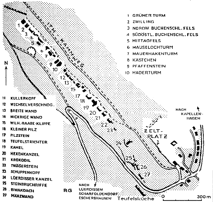 Die Felsen sind bei gutem Kletterwetter häufig überfüllt, insbesondere auch, wenn der nahe Zeltplatz wieder geöffnet ist. Vom DAV-Jugendzeltplatz ist man in 15 Minuten an den ersten Felsen.