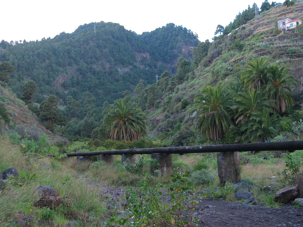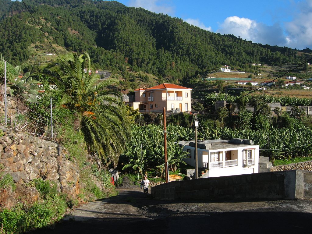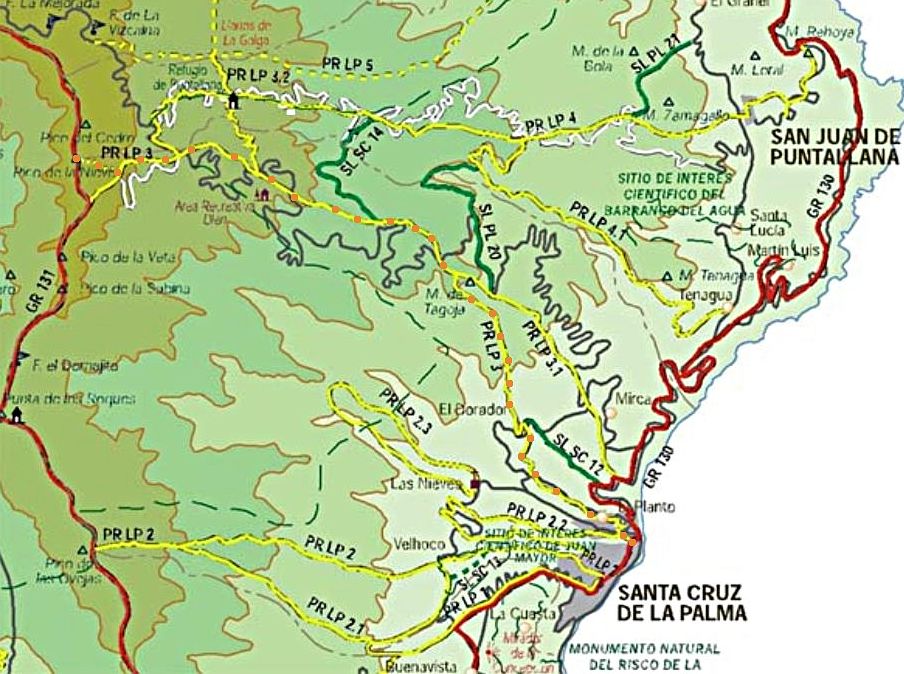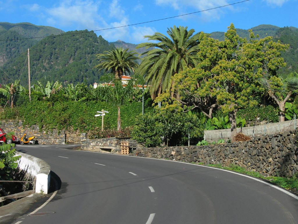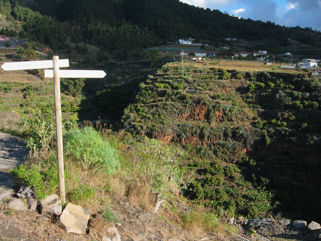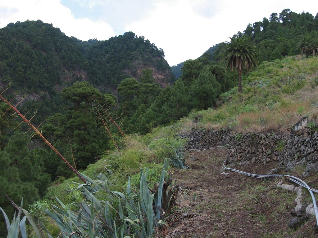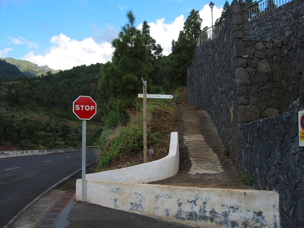 Start- und Endpunkt der Tour war mein Hotel Maritimo. Gegenüber dem Museumsschiff auf der anderen Seite der Avenida de las Nieves zweigt eine Bergstraße ab, die nach Las Nieves führt. Hier beginnt der Wanderweg PR LP3. Wegen einer Baustelle übersah ich beim Aufstieg den ausgeschilderten Weg. Am Ortsausgang von Santa Cruz verläuft der Weg auf der Straße nach Las Nieves. Nun befand ich mich auf dem richtigen Weg. An den Wegkreuzungen war der Weg gut ausgeschildert. Auf Höhe 250 m musste ich erstmal wieder 85m absteigen, um einen Ausläufer einer Barranco zu durchqueren - das Ganze dann noch einmal auf dem Rückweg. So waren noch 170 Hm zusätzlich zum eigentlichen Aufstieg von etwa 2230 Hm zu bewältigen.