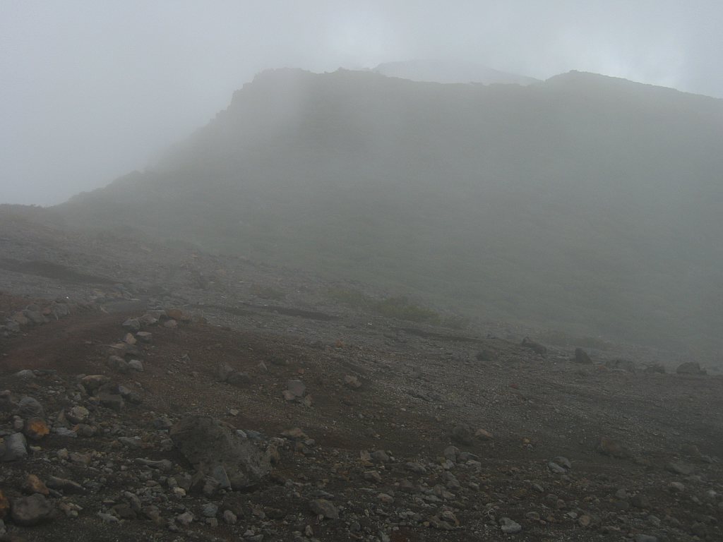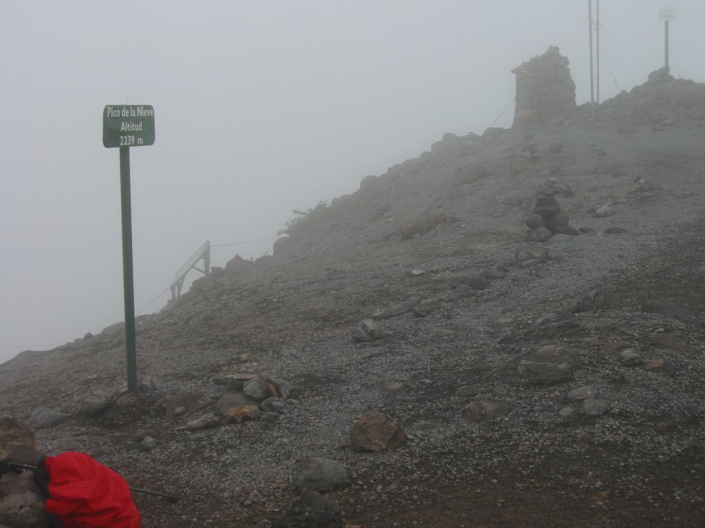 Ab Parkplatz benötigte ich noch eine Stunde bis zum Gipfel. Die letzen 200 Höhenmeter nahm mir ein Wolkennebel die Sicht. 13:45 Uhr stand ich endlich auf dem Gipfel. Im Nebel war es hier oben ungemütlich nasskalt, weshalb ich mir nur eine kurze Verschnaufpause vom 20 Minuten gönnte. Um mich wieder aufzuwärmen, begann ich zügig abzusteigen.
